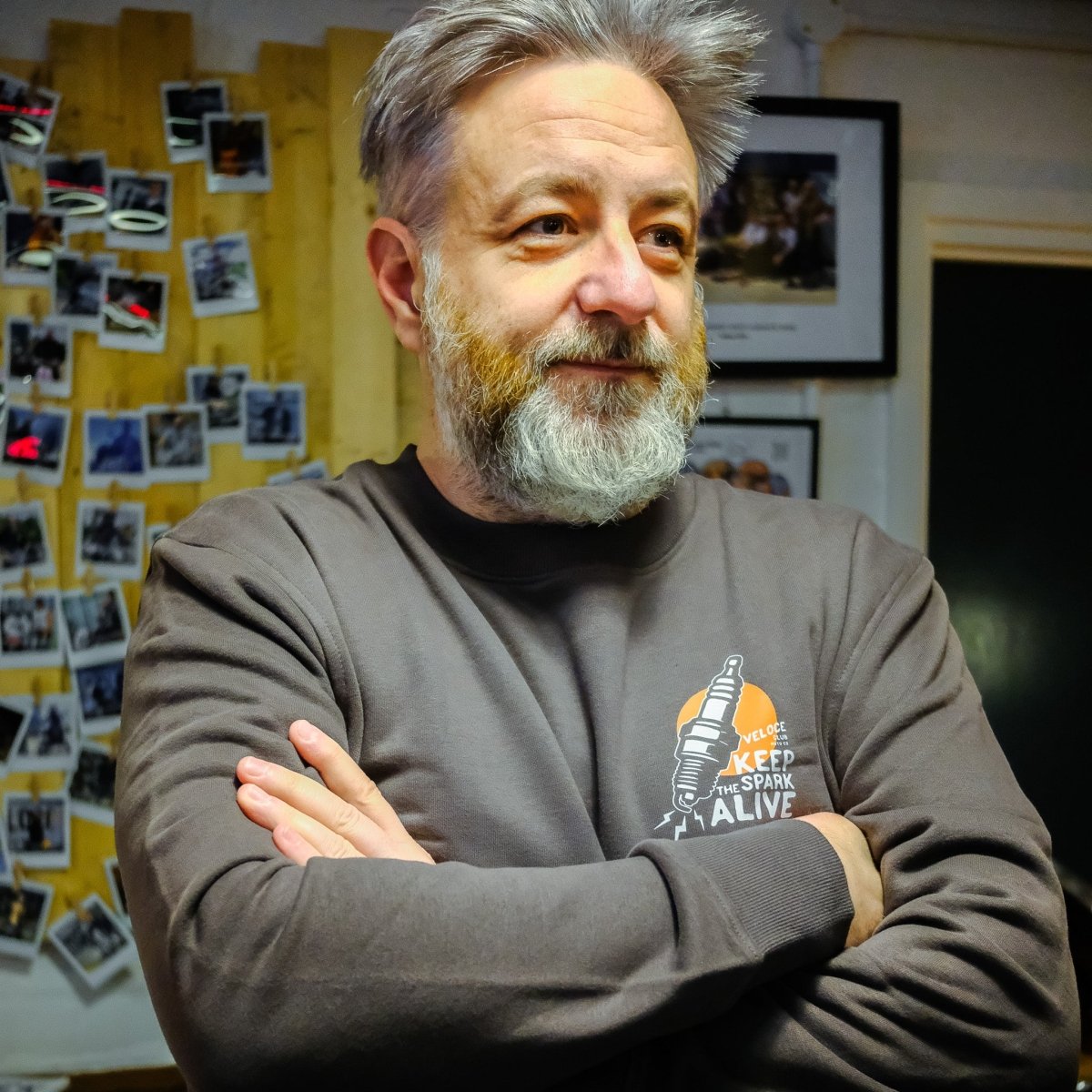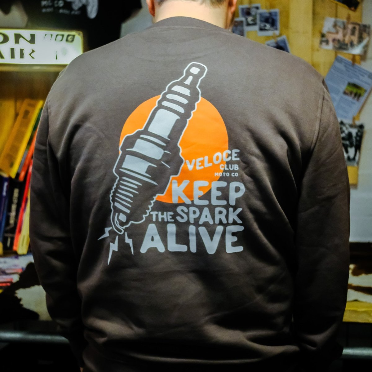 The new Veloce Club Spark sweatshirt is a bold tribute to the spirit of motorcycling and the passion that drives every rider. Featuring a striking hand-drawn spark plug graphic against a vivid orange backdrop, the design embodies the club’s mantra - Keep the Spark Alive.